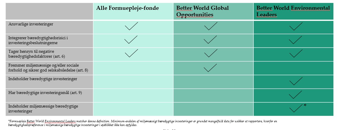 Definitionen på bæredygtige investeringer fremgår af disclosureforordningens artikel 2, nr. 17. På nuværende tidspunkt er det kun i Better World Environmental Leaders, at der garanteres en minimumsandel af bæredygtige investeringer. Det er dog ikke ensbetydende med, at der ikke også kan være bæredygtige investeringer i øvrige fonde – det er dog ikke noget vi garantere en minimumsandel af.