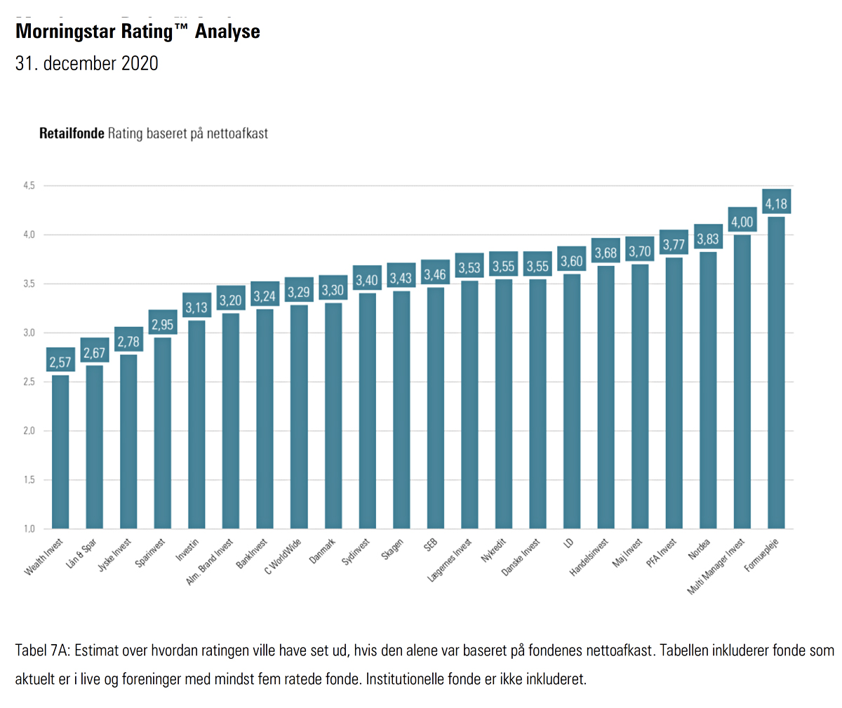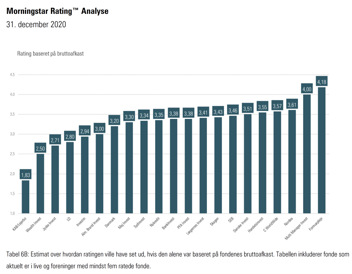 Det gælder eksempelvis både rangeringen med estimat over, hvordan ratingen ville have set ud, hvis den alene var baseret på fondenes bruttoafkast og en tilsvarende opgørelse baseret på fondenes nettoafkast. Ligeledes ligger Formuepleje nummer et på nettoafkastet, hvis der også korrigeres for den risikofri rente, og nummer to på den endelige rating, når der er korrigeret for alle elementer.