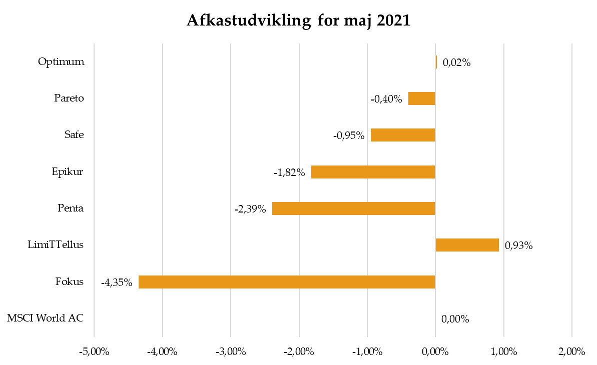Overordnet set endte det globale aktiemarked i maj med en beskeden stigning på 0,1% målt i danske kroner. Udviklingen blev drevet af en stærk afslutning på måneden efter at være nede med cirka 2%. De europæiske aktier var månedens outperformer med et afkast på 2,7% og alle 11 europæiske sektorer endte i positivt territorium, mens danske konverterbare realkreditobligationer var mere udfordrede.