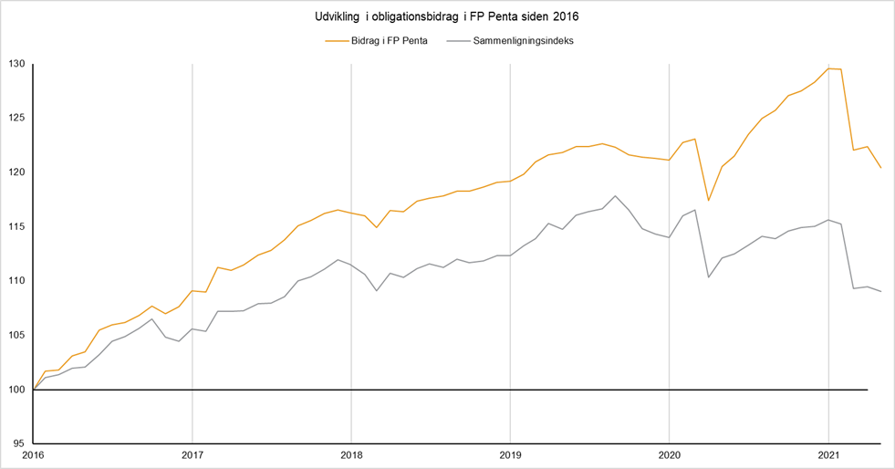 Effekten af ovenstående er, at alle Formueplejeforeningerne med realkreditobligationer har fået et negativt bidrag i 2021 fra obligationsbeholdningen. I nedenstående figur vises effekten på Formuepleje Penta.
