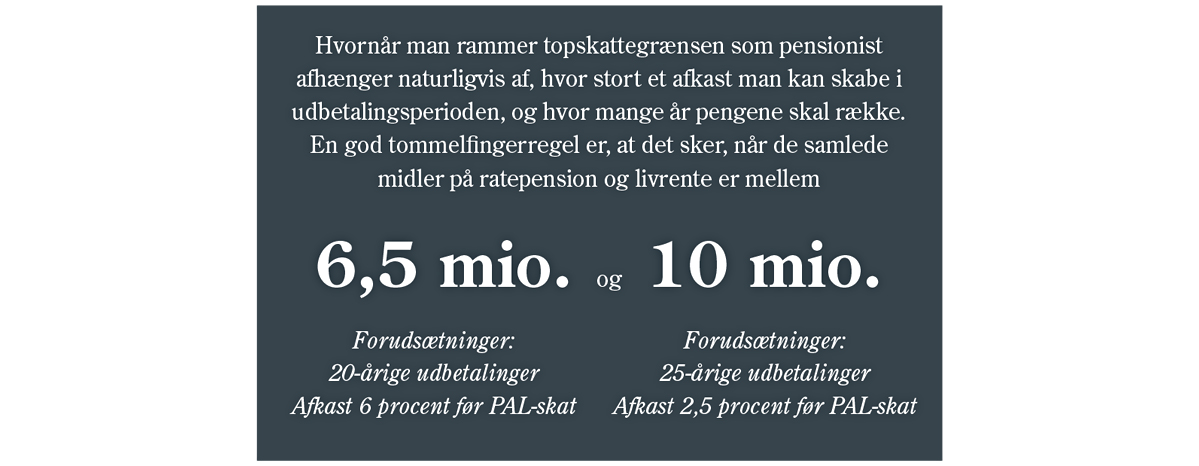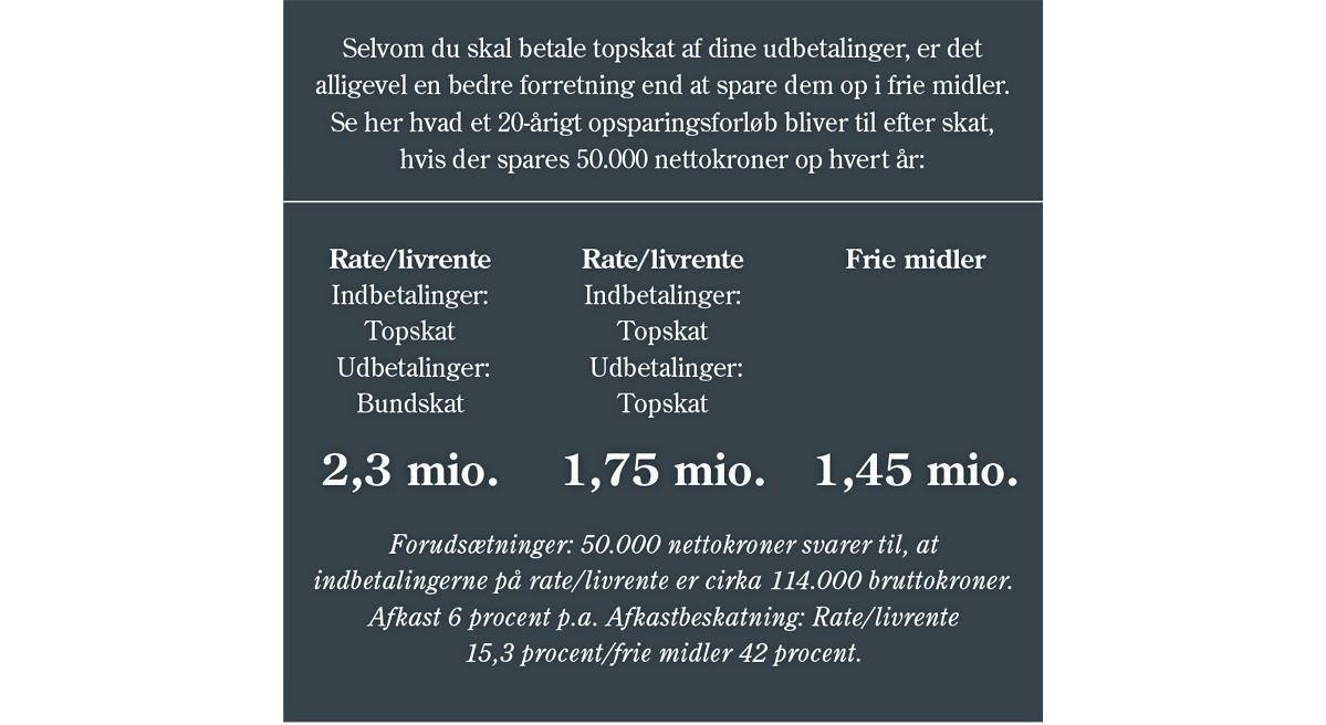 Men tilbage til spørgsmålet om, hvorvidt du skal stoppe med at indbetale til dine pensionsordninger, når prognosen viser, at du rammer de 6,5 til 10 millioner på pensionstidspunktet. Det skal dit fremtidige behov som sagt afgøre. Men hvis vi sammen finder ud af, at du skal fortsætte indbetalingerne til ratepension og livrente, så er der ingen grund til at blive meget ked af det, fordi de fremtidige udbetalinger kommer til at blive topbeskattet. Så er det ganske vist ikke længere en vanvittig god forretning, men blot en god forretning. Det skyldes, at det stadig er en kæmpe fordel, at afkastet inde i pensionsordningerne kun beskattes med den lave PAL-skat på 15,3 procent og ikke op til de 42 procent, som vi kender fra frie midler.