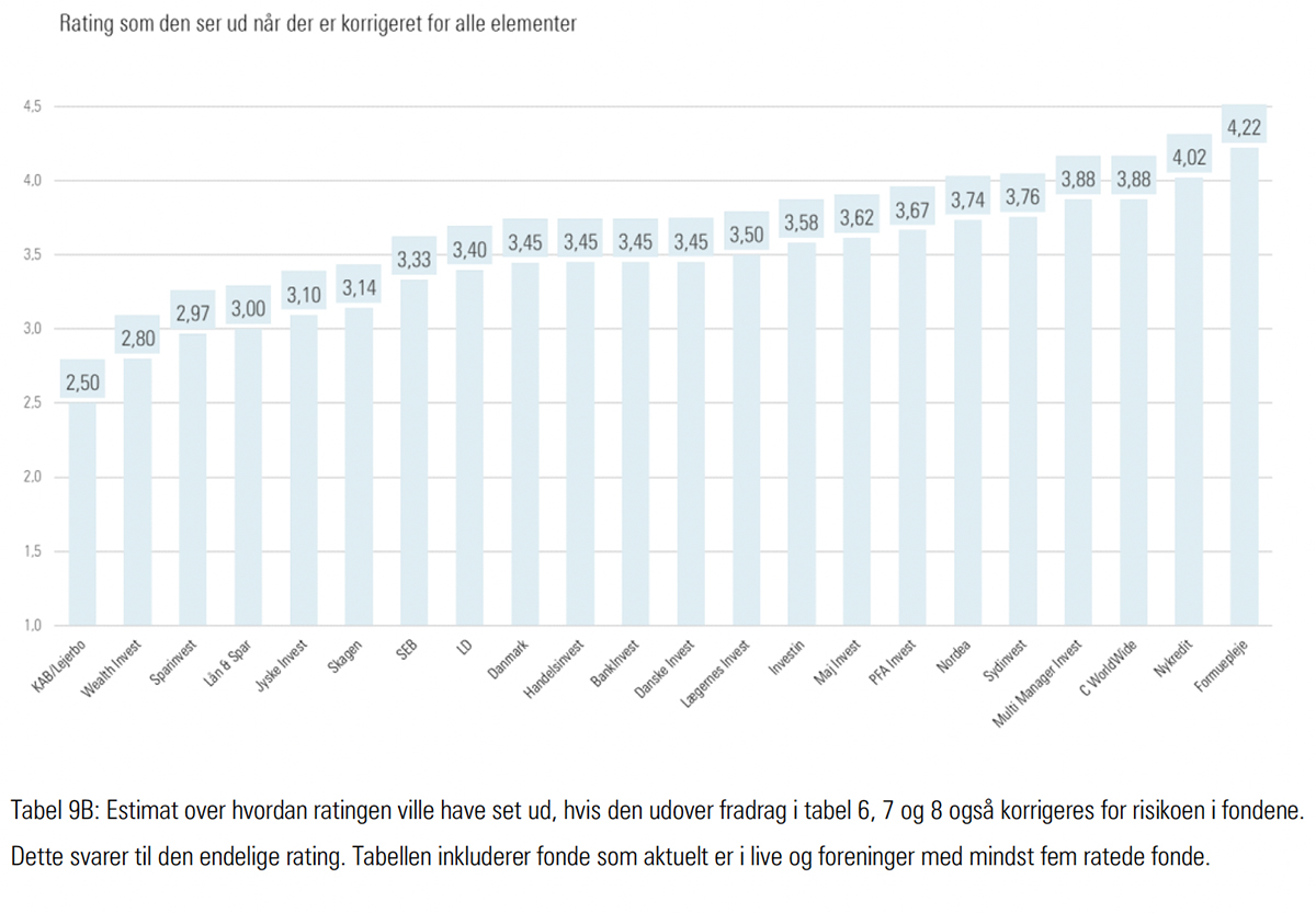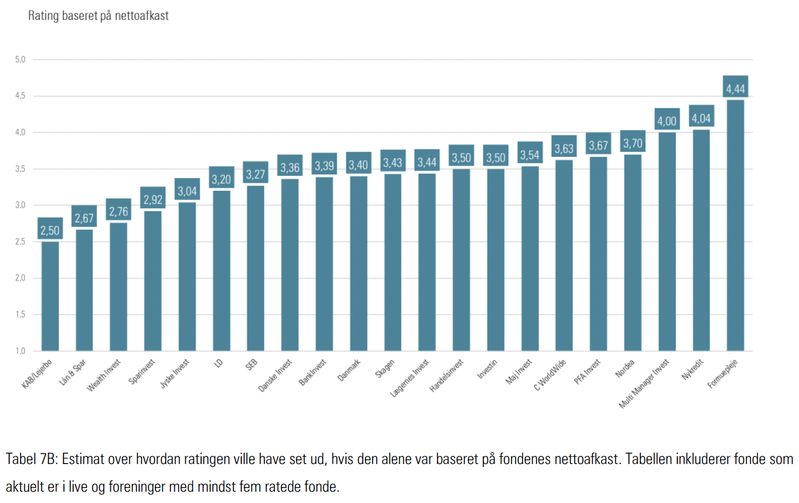 I alt figurerer 21 danske investeringsforeninger på listen, og Formuepleje topper de fleste af de ratings i målingen. Både når det drejer sig om bruttoafkast, nettoafkast, når der er korrigeret for risikofri rente samt den endelige overall-rating ligger Formueplejes således nummer et.