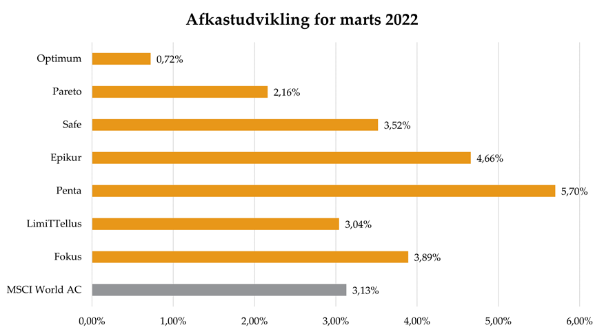 To centrale forhold, der danner baggrund for aktieudviklingen i marts er som tidligere nævnt dels krigen i Ukraine samt bevægelsen mod højere renter i både USA og Europa.