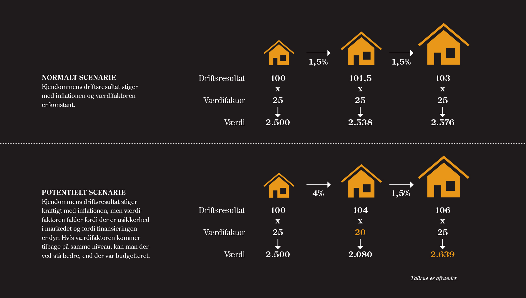 Når man taler om ejendomsinvesteringer, skal man dog huske, at ejendomme har to afkastgeneratorer. Den ene er kapitalværdier, som kan bevæge sig op og ned. Den anden er selve ejendomsdriften. Og når kapitalværdierne svinger, skabes der fortsat lejeindtægter. Når vi som nu ser høje inflationstal, som skaber højere lejeindtægter, virker disse som modvægt til kapitalværdiernes fald, hvilket skaber en større prisfasthed.
